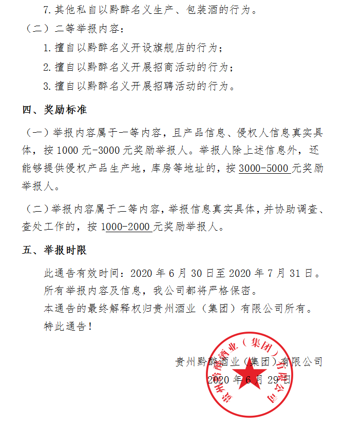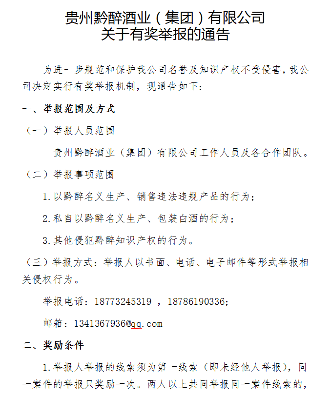貴州黔醉酒業(yè)(集團(tuán))有限公司 關(guān)于有獎(jiǎng)舉報(bào)的通告